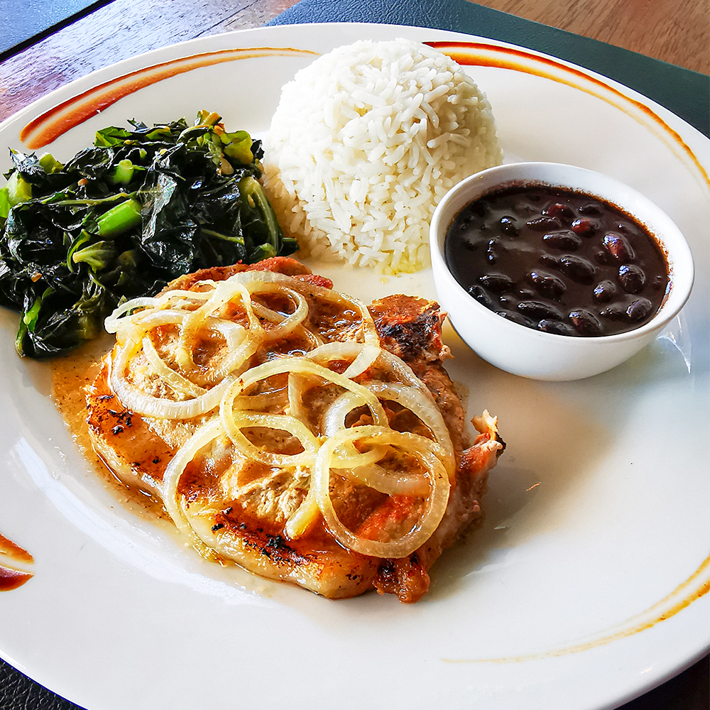 Costeleta suína grelhada, tutu de feijão, arroz e couve.