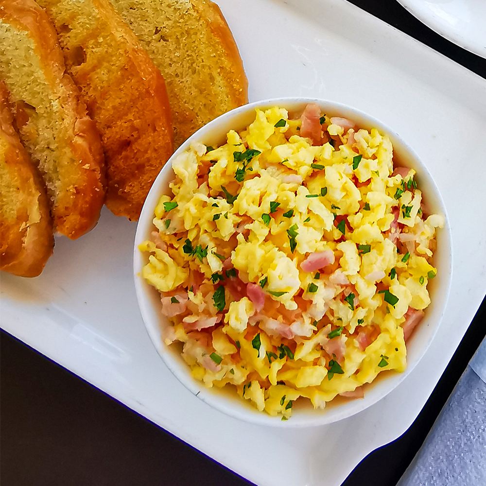 Ovos Mexidos com Queijo, Fiambre e Pão.