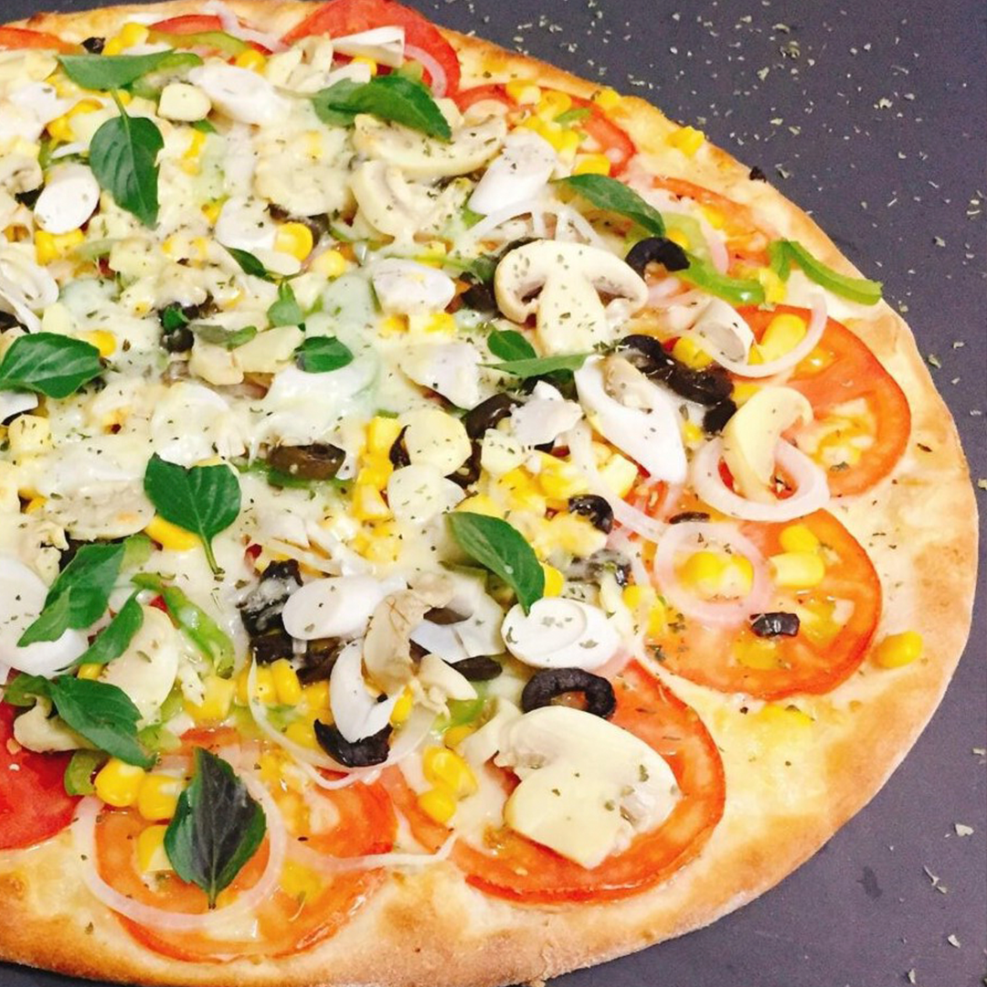 Massa, molho de tomate, mussarela, tomate, cogumelos, milho, pimentos, manjericão, cebola, orégano e azeitona.